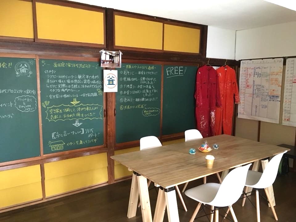 1つ目は、コンセプトの「田舎にある我が家。」に合わせて、この家を我が家のように感じられるよう、インターン生の理想とする家のイメージを大切にして、改修を進めたことです。そのため、「糸と吉~ゆい~」の内装には1期生、2期生それぞれのこだわりが詰まっています。特に、玄関や共有スペースに大きな黒板を設置したり、リビングに歴代のインターン生の記録を残しておけるスペースをつくったことで、交流の生まれやすい家になっています。