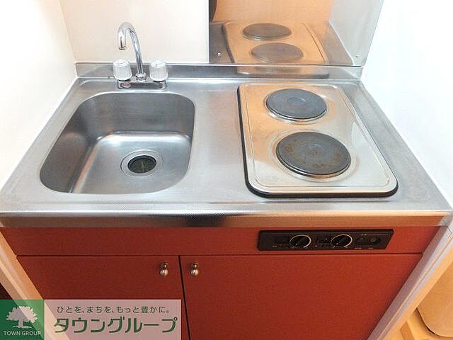 2口電気コンロのほか電子レンジや2ドア冷蔵庫付