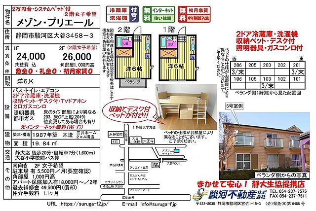 学生専用(2階女子)2ドア冷蔵庫・洗濯機・デスク付き収納ベッド・無料インターネット付 静岡大学向け