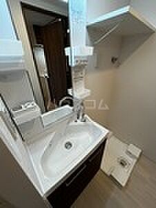 化粧品やスタイリング剤などをまとめて出して、サッと身支度を整えられる独立洗面台を採用しています。