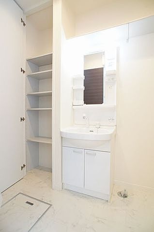身支度に便利な洗髪洗面化粧台です。洗面所にも収納棚を設置しているので水周りの小物を置くのに重宝します!