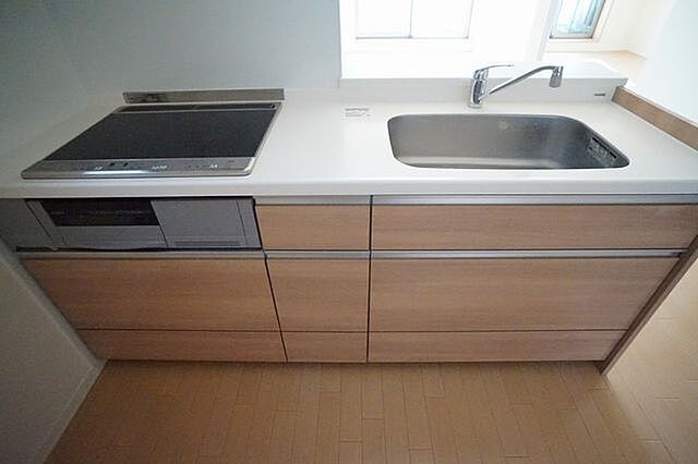 換気窓のある対面カウンターシステムキッチンです。(グリル付3口IHクッキングヒータ)