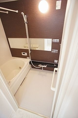 ■浴室■1日の疲れを取るお風呂は壁の一面だけ色を変えてアクセントを付けています。沸かし直しができて便利な追焚機能付き☆温度調節可能なサーモスタット水栓♪シャワーとカランの切替も楽ちんです☆