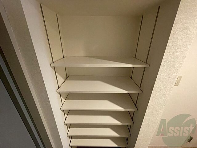 こちらの収納にはハンガーをかけて服もしまえますね。