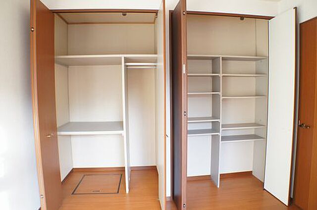 2本のハンガーパイプと机棚・枕棚を配した壁一面のクローゼットは、天井の高さも活かしてたっぷり収納できます♪