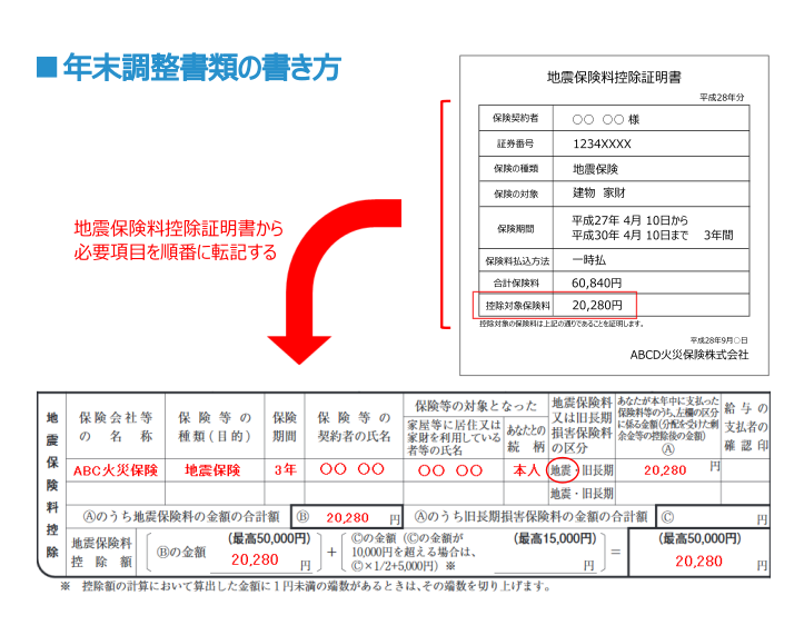 年末調整書類のうち保険料控除申告書と記載されている書類の下の方に、地震保険料控除という欄があり、ここに地震保険の契約内容について記載していく。その際、必要な事項は地震保険料控除証明書に記載されているので、この証明書を用意して順番に転記するようにする。