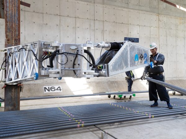 「配筋アシストロボ」は、建設現場のなかでも特に作業員の人数を必要とし機械化が難しいとされていた重量鉄筋の配筋作業を担う。従来、6~7人は必要だった重量200㎏クラスの重量鉄骨の配筋作業を3人で効率的に行う。