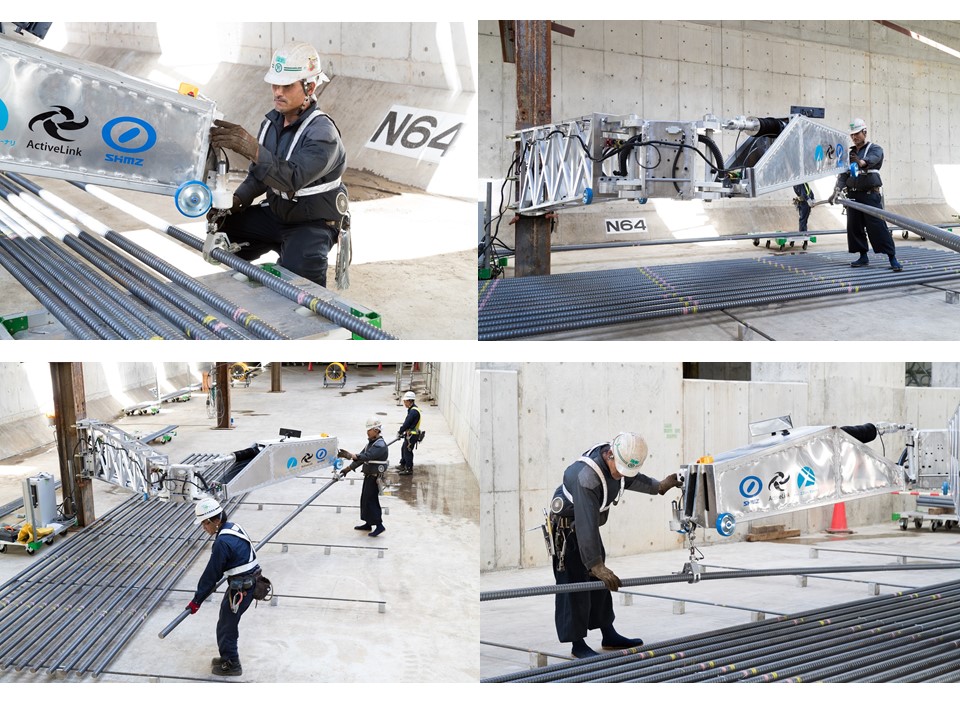 i-Constructionに合わせ清水建設株式会社、アクティブリンク株式会社、株式会社エスシー・マシーナリは、重量鉄筋の配筋作業を支援する「配筋アシストロボ」を共同開発した。清水建設とエスシー・マシーナリが建設現場のニーズ抽出や企画・立案、実証実験を、アクティブリンクが設計、製作を担当した。