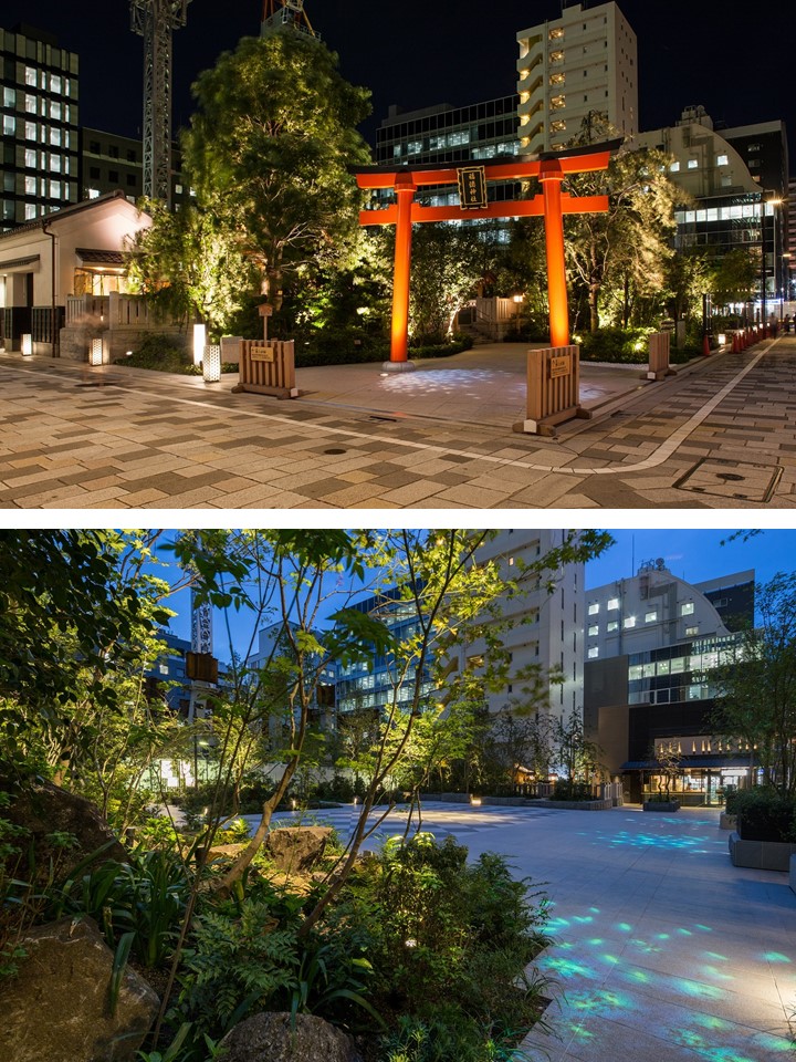 「福徳神社」「福徳の森」の照明計画は、金閣寺や平等院鳳凰堂を手掛けた内原智史(さとし) 氏が監修。神社と森とを一体的に暖かく美しい光で象徴的に包む。季節感も大切にされており、春の桜、秋のもみじなど季節を象徴する植栽には、移動可能な照明装置でライトアップが施されているこのほかにも、夜になれば福徳神社、福徳の森では、仲通り、浮世小路と一体的なライトアップもなされ、一層幻想的な雰囲気を醸し出す。これは、景観づくりへの配慮でもあるが、日本橋の街をより魅力的に生まれ変わらせるための意気込みの一つでもある。