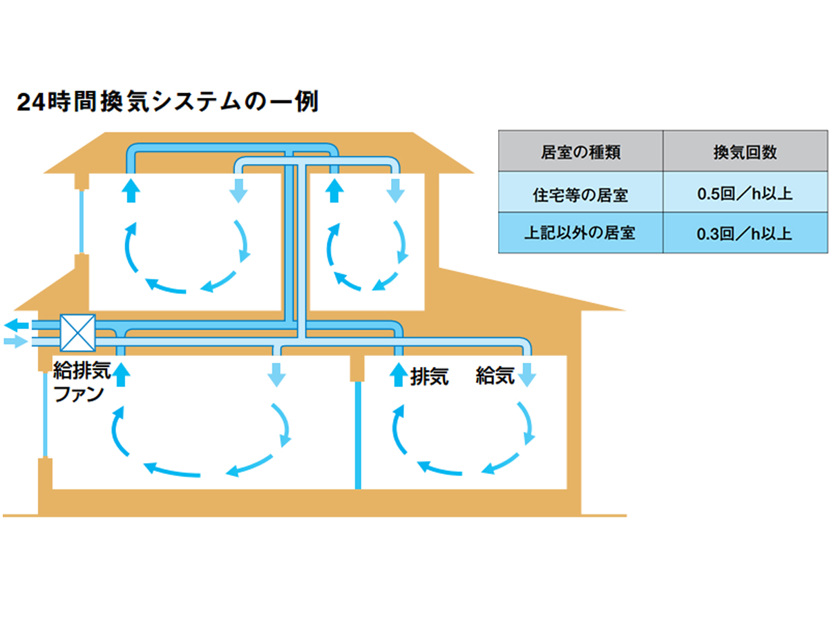 とはいえ、空気環境への関心が高まったのは今にはじまったことではなく、2003年7月の建築基準法改正で換気設備の設置が義務付けられたことで一気に注目されるようになった。この改正は、シックハウス症候群の原因となるホルムアルデヒドなどの化学物質の室内での濃度を下げるために、建築物に使用する建材や換気設備を規制するものだ。このうち、換気設備の規制については、原則としてすべての建築物に機械式の換気設備、いわゆる24時間換気システムなどを設置し、住宅の場合は1時間で室内の半分以上の空気を入れ替えなければならない。