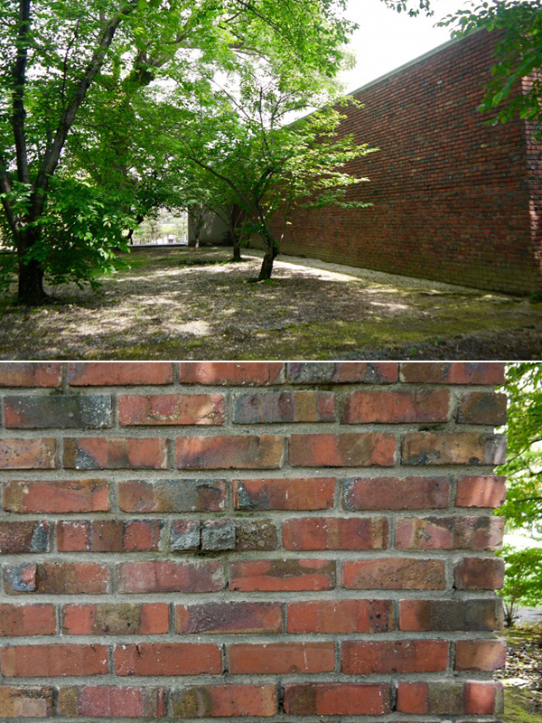 ”テクニカル・アプローチ”における林原美術館の特徴は、窓のない展示室棟の外壁全面に“焼き過ぎ”レンガを貼っていることだ。廃棄されていたものを拾い集めて使ったといわれる。重厚で質感豊かなレンガは、それまで前川が追求してきた近代建築を象徴する、ガラスやスチールとは明らかに異質な素材だ。