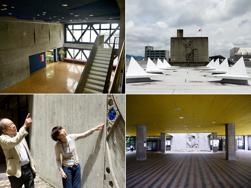 ピロティーから屋上までの吹き抜けの壁面には高さ18mのレリーフが彫られている。これは前川が、当時29歳の若き彫刻家・山縣壽夫に依頼したものだ。海中から天空へ飛翔する鳥を表現し、「鳥柱(ちょうちゅう)」と題した。完成から54年の時を経て、2016年に修復が行われ、地元の学生たちが剥落した色ガラスを再現。83歳になった山縣氏本人も、神奈川県から駆けつけて手本を示したそうだ。