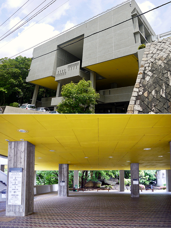 (上)天神山文化プラザ西側外観。建物が張り出した部分がピロティーになっている。正面中央部は外階段。手すり壁に刻まれた上下互い違いの模様が、行き交う人の動きを表現している(下)ピロティー。正面に天神岩が祀られている。右手奥にホール、手前に展示室の入り口がある。左手の階段はかつての図書館と日米文化センターに続く。今はいずれも展示室になっている平坦な地形が広がる岡山市にあって、頭ひとつ飛び出した「天神山」には、古来、神が鎮座するとされ、頂部に巨大な「天神岩」が祀られている。戦前の岡山県庁は、この場所にあった。