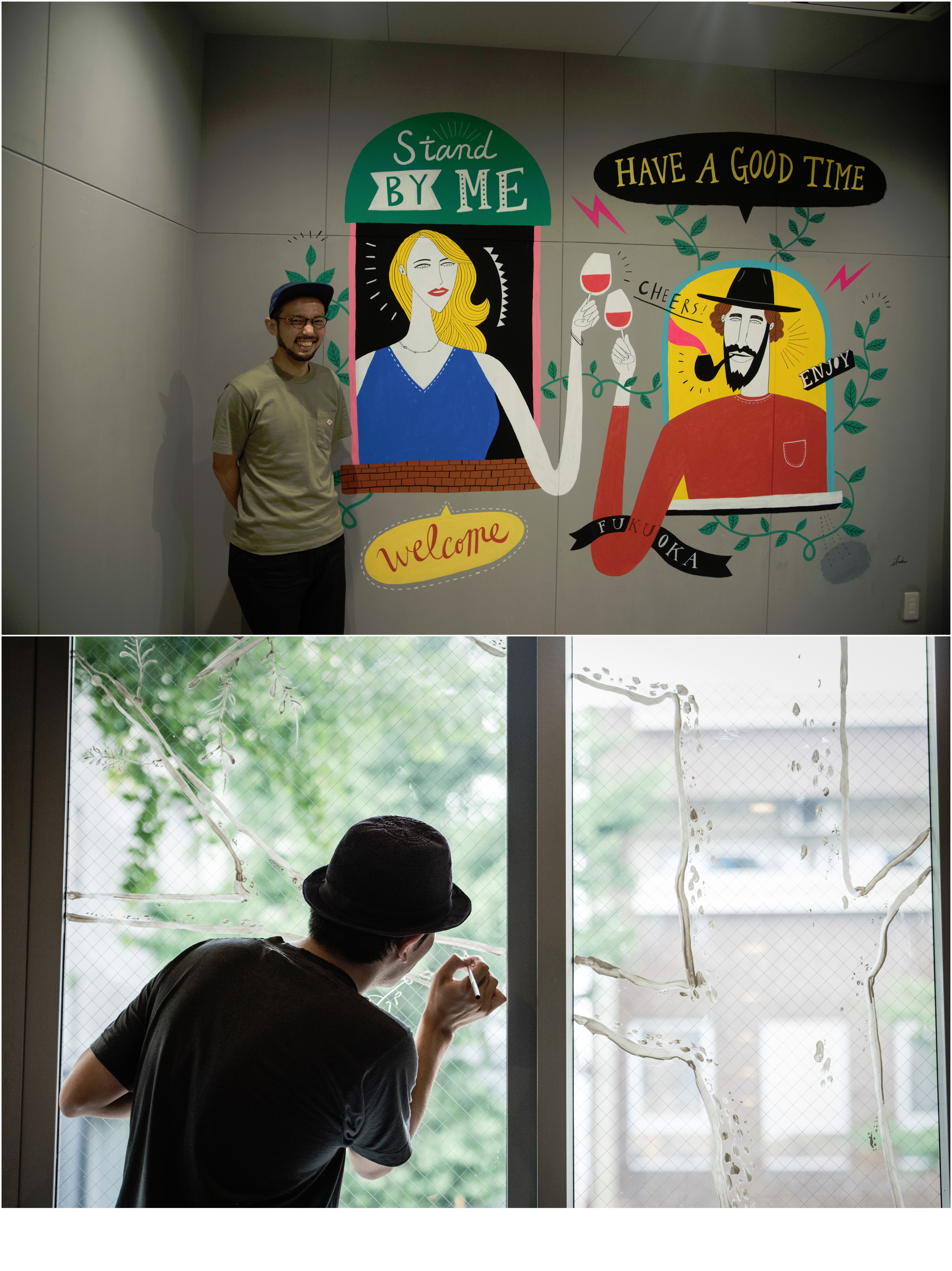 部屋はホステルらしく、男女共用、女性専用のいずれもドミトリーにツインの個室があり、それ以外には共用の水回り。室内で印象的なのはあちこちに飾られた地元アーティストたちの作品だ。建物1階のガラス扉には画家の田中健太郎氏が描いた木々や梟が来訪者を出迎え、室内壁面にはカラフルな作風で知られるイラストレーターイフクカズヒコ氏の男女が乾杯するイラストが楽しい時間を予感させるといった具合。その他、堀越千秋氏、沖健一氏、Kyne氏とテイストの異なる絵画が飾られている。