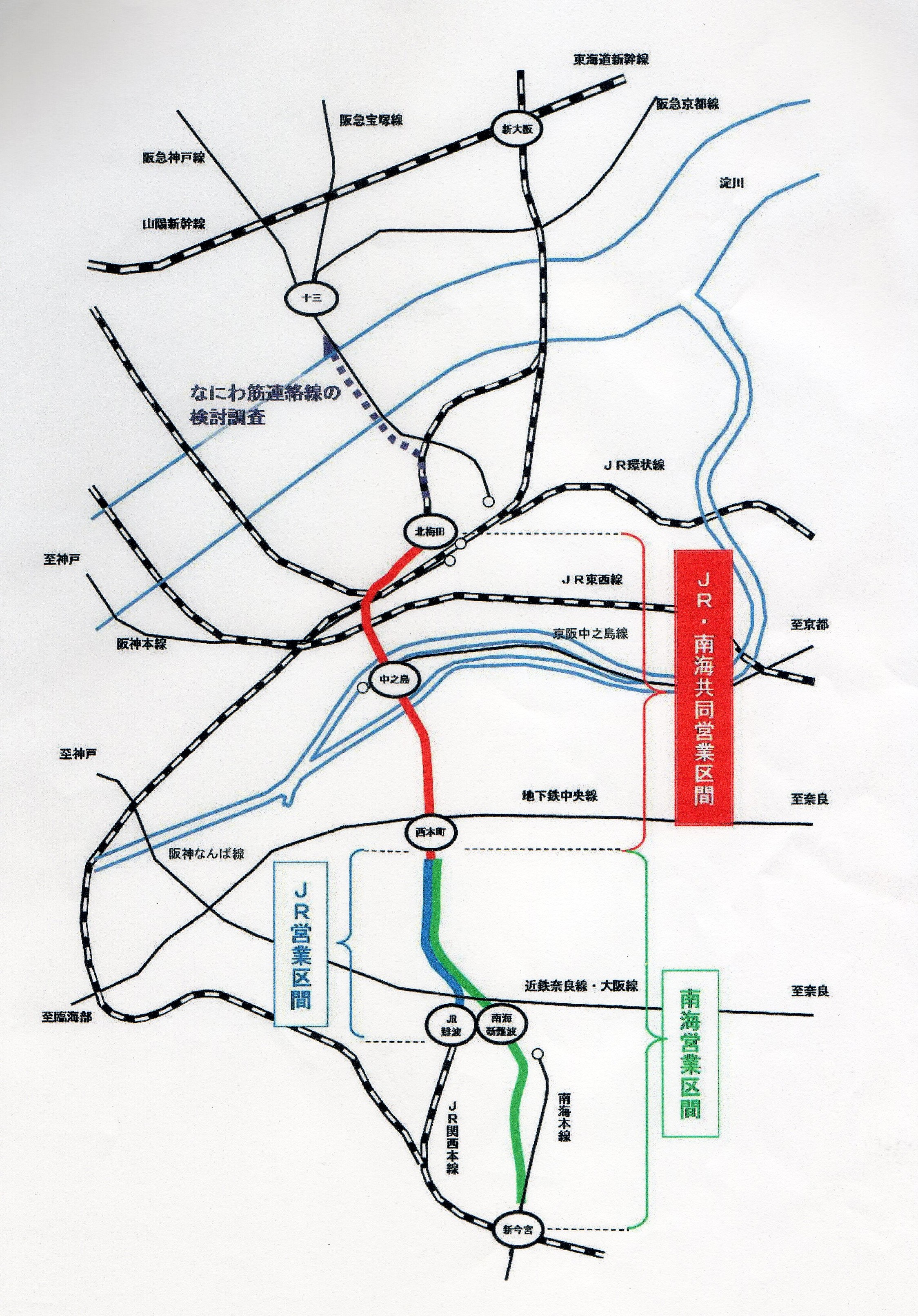 なにわ筋線とは、大阪市内を南北に縦断する「なにわ筋」の地下への建設が予定されている鉄道新線である。その路線としては、大阪駅北側地下に建設中の「うめきた新駅(仮称)」からJR難波駅に至るルートと、南海電鉄・新今宮駅に至るルートの2つがあり、それぞれJR阪和線と南海本線を経由して関空に至る。また阪急電鉄も、十三駅とうめきた新駅とをつなぐ「なにわ筋連絡線」の整備に向け、調査・検討を進めていくという。