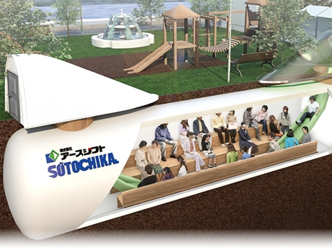 ソトチカは自宅の庭に埋める個人用のほか、学校や公園、公民館、各自治体施設などの公共施設に設置する防災倉庫などに対応し、緊急避難スペースとして40~50人ほど収容可能な大型タイプ(直径2.83m、全長13.5m)も開発済という。