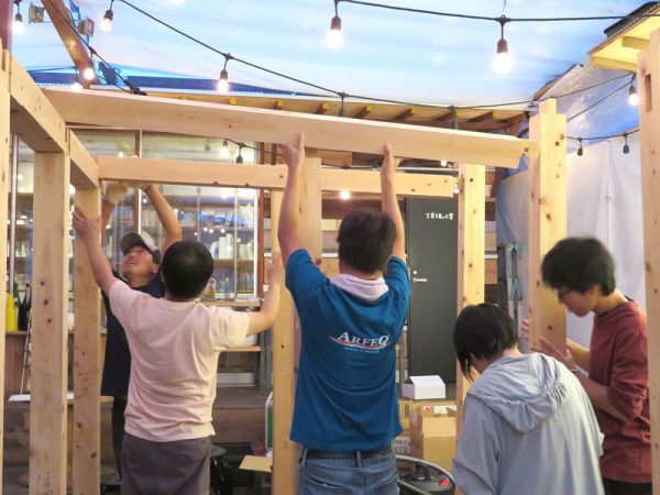 本当は基礎を打つ作業があるが、今回の場所は仮設で木の床がある場所のため、それは省略。実際の災害時も基礎までは作っている時間はなかろう。骨組み、壁だけでもあれば、雨風から身を守るようになるから、当座の住まい作りという意味ではそれで充分でもあると思う。