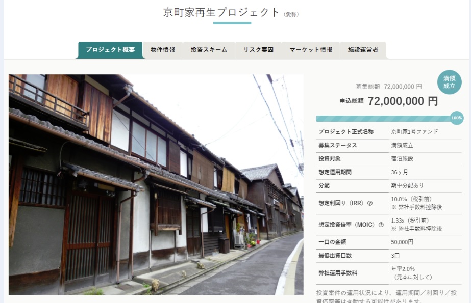その建物に目をつけたのが町家を一棟丸ごと宿泊施設として貸し出すやり方で事業を行っている株式会社トマルバ。物件取得及び改修費用をクラウドファンディングで集めて改修。同社が運営を行い、約3年後にはファンド事業者であるクラウドリアルティから別のオーナーへと宿泊施設の持ち主が変わる、つまり、ファンド事業者としては宿泊施設を売却するという計画で出資を募った。