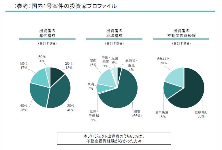 結果、第一号案件の京町家は2017年5月25日~の3週間で110人から7200万円を集め、事業がスタート。6月28日から改修が始められている。これなら自分にも始められる!と思った人が多かったのだろう、出資したうちの約65%が不動産投資経験のない人たちであり、かつ30代(40%)、40代(27%)の若い人が多かったという。