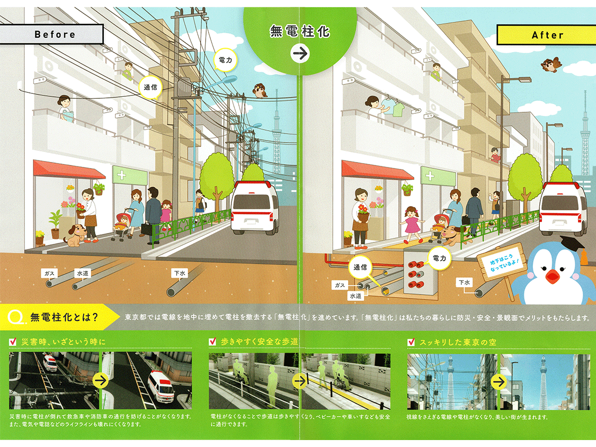 安全で快適な歩行空間の確保は、一般の歩行者だけでなく車椅子やベビーカーの通行の妨げにもなっている電柱の現状を改善し、それと同時にバリアフリー化を進めようとするものだ。