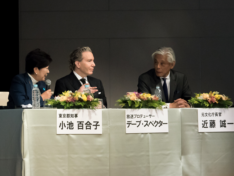 東京都内在住・在勤・在学の人を招いて開かれたイベントには、小池百合子東京都知事のほか、コメンテーターとして放送プロデューサーのデーブ・スペクターさん、元文化庁長官の近藤誠一さんが出演し、フリーアナウンサーの石山愛子さんがコーディネーターを務めた。