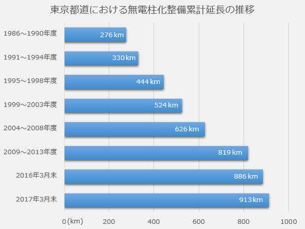 国土交通省がまとめた資料によれば、ロンドン、パリ、香港などはかなり早い時期に100%の無電柱化率を達成し、台北(95%:2013年時点)、シンガポール(93%:1998年時点)などアジアの主要都市も高い無電柱化率となっている。それに対して東京23区はわずか8%、大阪市は6%(いずれも2016年度末時点)にすぎない。