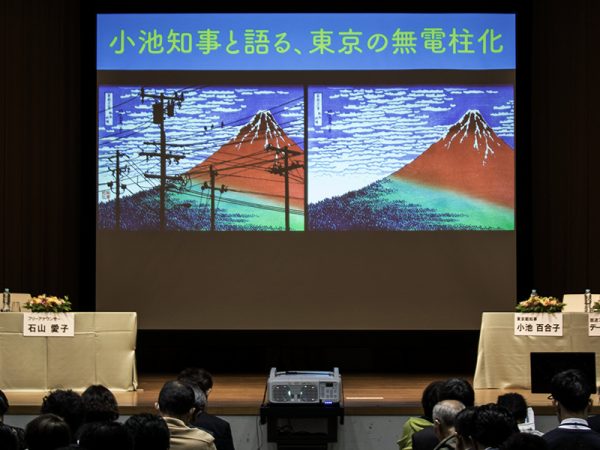 無電柱化推進法が施行されてから初めての「無電柱化の日」となった11月10日には、各地で無電柱化をテーマにした催しがあった。それらのうち、夕方から東京都庁で開かれたのは「小池知事と語る、東京の無電柱化」(主催:東京都)だ。