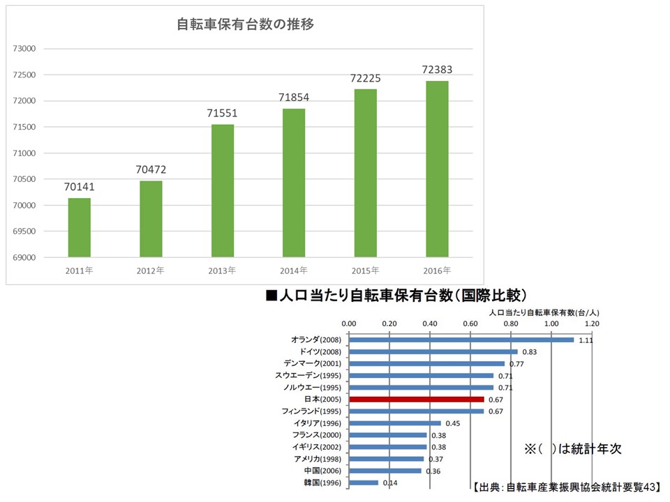 実際に日本で自転車を利用する人は年々増えており、その保有台数は約7,200万台(2016年)と自動車の約8,000万台と同程度になっている。また、一人当たりの保有台数は0.67台(2005年)となっており、欧米先進国と比較しても決して少なくない。この状況は一過性のブームではなく、日常の移動手段、そして一般的な趣味として根づいているということだろう。