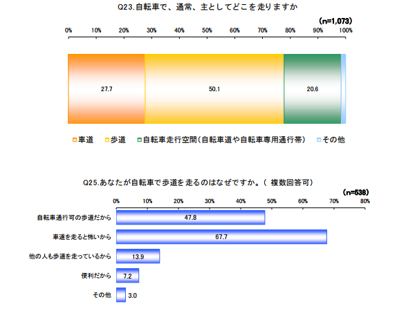 しかし、自転車で狭い車道を走っていると、追い抜かされる自動車に接触しそうになるし、ときには迷惑そうにクラクションを鳴らされるなど、安心して走ることができない道路が多いのが現状だ。東京都が2015年に公表したアンケート結果によれば、自転車利用者のうち、走行する位置として「歩道」と回答した割合は50%以上を占めており、このうち、歩道を走行する理由としては「車道を走ると怖いから」が67.7%存在している。
