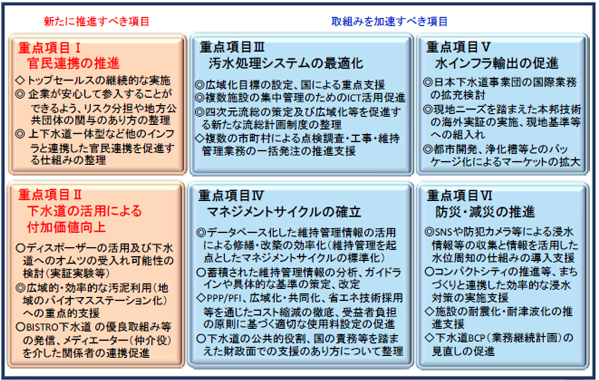 「新下水道ビジョン加速戦略」では、5年程度で実施すべき施策として以下の8つの重点項目を設定している。