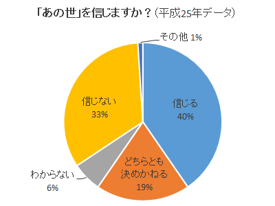 文化庁の宗教関連統計に関する資料集によると、ご先祖様を尊ぶと答えた人は66%で、1年に1回以上墓参りに行く人は72%、あの世を信じるかについては「信じる」が40%で、「信じない」の33%を上回っている。ちなみに「どちらとも決めかねる」と「わからない」のニュートラル派が25%いるので、完全否定の約2倍の人が、なんとなく「あの世」に何かしらの思いを抱いているということになろうか。