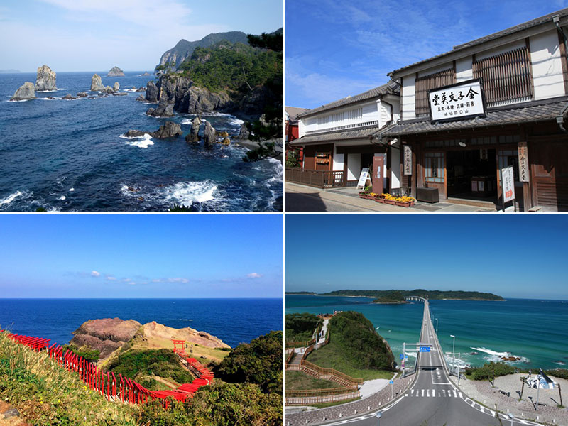 近年は、岬に並ぶ赤い鳥居が圧巻の、元乃隅稲成(もとのすみいなり)神社が外国人観光客に人気だ。自動車のCMで話題を呼んだ、エメラルドグリーンの海に架かる角島大橋も近い。