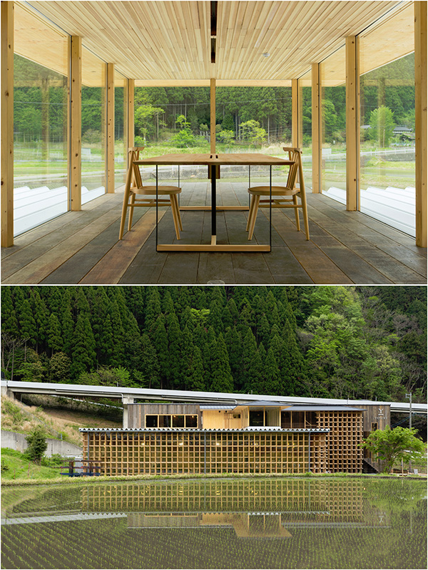 ちなみに外壁には東本願寺のご修復で5~10年使った合板足場板が使われた。これも新しいけれど古い品で、それがあってか水田の中の建物としては奇抜に思われる形ながら、少しも違和感はない。以前からそこにあったと言われたら信じる人もいるだろう。