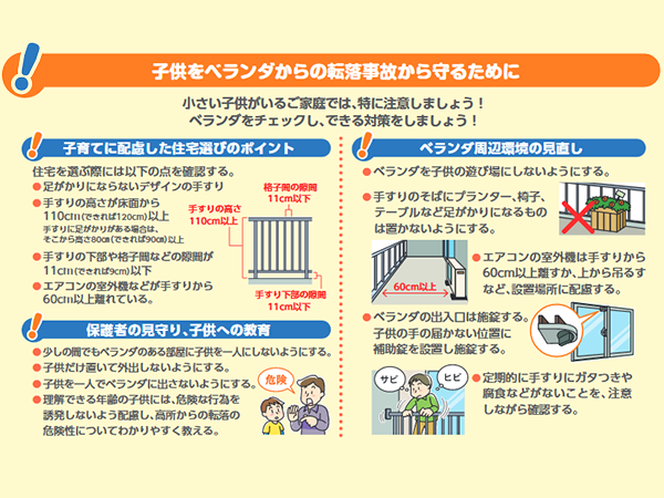 住居からの転落事故は、特に春から夏に多く発生している。できるだけ子どもをベランダに出さないようにすることは防止のための大前提ではあるが、四六時中一緒にいて見ていることは難しい。ベランダの環境の見直しとともに予防に努めたい。