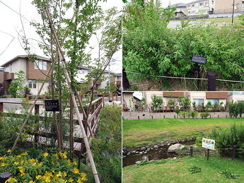 また駐車場は、タマリュウ目地や芝等による緑化、化粧砂利、石貼り等の美化舗装を採用。1台目は事業主の指定した位置と向きとし、2台目は駐車スペースの半分は芝生にするなど、極力緑が多く見えるようにという配慮がされている。駐車場の3台並列駐車は禁止となっている。この他、門柱は秦野駅前水無川にかかる「まほろば橋」の欄干をモチーフにしたデザインを、庭には自然石のバードバスやレインガーデンで宅地内の雨水をゆっくり処理するしつらえも。