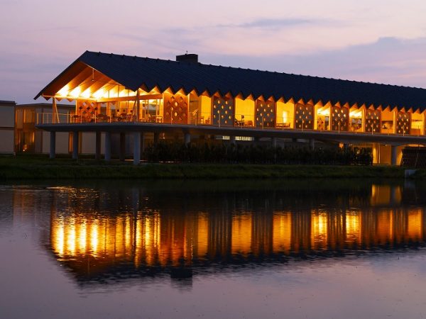 基礎やコア部分以外はすべて木造で、ラウンジでくつろいでいても、廊下を歩いていても、客室に入ってからも、常に木の温もりを感じることができる。また、施設内には地下水を利用した水冷ヒートポンプエアコンを導入。ヒートポンプの熱交換に使った地下水は、農業用水の代わりとして稲作に二次利用するなど、デザイン性だけでなく先進のエネルギー循環機能も備えている。