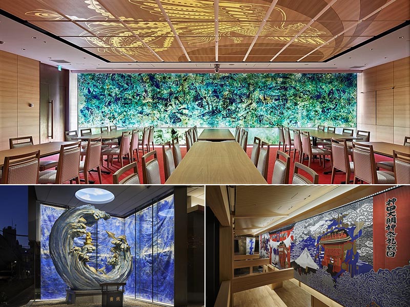 4階の貴賓室に掛けられた絵画作品「光の森」は、仏レジオン・ドヌール勲章の受勲者でもある松井守男氏が、「鎮守の森」をテーマに描いたもの。また、建物の東南角には、松井氏と金工作家・宮田亮平氏とのコラボによるオブジェ、二の宮・少彦名命「えびす様」と「blue・bleu・ブルー」が置かれ、ホワイエには着物デザイナー・斉藤上太郎氏が手掛けた全長20mの「神田大明神祭礼絵図/西陣織」が掛けられている。