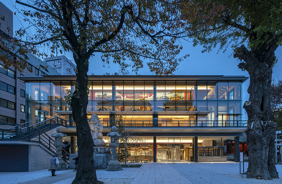 黄昏時には、ライトアップされた館内のアートが浮かび上がり、神田祭のざわめきが境内を満たしていく。ガラス越しに響き合う、神社の風景と現代アート。それは、「伝統と革新」の融合を追求する過程でクリエイターたちが生み出した、一つの答えといえるかもしれない。