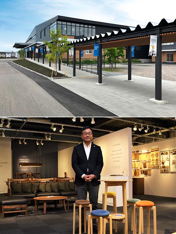 JR旭川駅から車で15分ほど走った国道沿いに、もともとは倉庫だった、重厚で黒い外観の巨大な建物がある。旭川市にある「旭川デザインセンター」。この地域は日本五大家具産地のひとつで、センターは40社が名を連ねる旭川家具工業協同組合が運営している。館内にはモダンな木のテーブル、表情豊かな一枚板、洗練された色とりどりのチェア、ゆったりとしたソファがずらりと並ぶ。施設の名前に「デザイン」と冠するだけあって、思わず「おしゃれー」とため息が漏れそうな雰囲気だ。