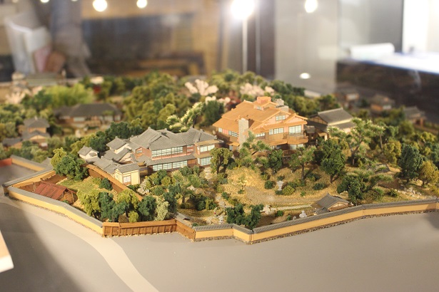 聴松閣の1階に展示されている1939(昭和14)年ごろの揚輝荘全体のジオラマ。写真中央のオレンジ色の建物が聴松閣、その左隣の揚輝荘座敷は現在工事中のため非公開。揚輝荘の場所は、今の名古屋・栄にあるテレビ塔の展望台とほぼ同じ高さだったそう名古屋駅から地下鉄で約14分。人気の住宅地としても知られる覚王山エリアに、名古屋を代表する名建築のひとつ、揚輝荘(ようきそう)がある。大正から昭和初期にかけて建設された、株式会社松坂屋の初代社長である15代伊藤次郎左衛門祐民の別荘だ。