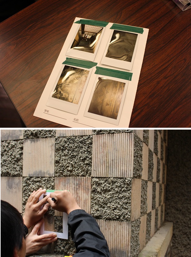 (写真上)好きだと思った場所をインスタントカメラで撮影。冊子に貼り付けて、思い出に(写真下)プラ板で気に入ったデザインを写し取る(文化財など貴重なものにペンで書いてしまわないよう、紙の枠も作って保護)。切り取り方の工夫が興味深かったイベントでは、建築デザインを探すほかに、気に入った場所をインスタントカメラで撮影することと、北園の好きなデザインをプラ板(ばん)に写し取る作業も。プラ板とは、プラスチック製の薄い板に絵を描き、オーブントースターなどで温めて加工しキーホルダーなどにするもの。イベントでは、デザインを写し取るのみで、自宅に帰ってから仕上げるようにとのことだった。参加した子どもたちを見ていると、選ぶところは十人十色。プラ板に写し取るデザインも、角度を変えたり、一部だけ切り取ったり、みんな工夫をしていた。建築デザインをより身近に感じられる取り組みだったのではないかと思う。