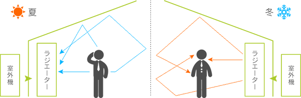 ラジエーターの中に温水、冷水を循環させることで室内の温度をコントロールする冷暖房機自体は1990年代からあった。ラジエーター内の温水、冷水と室温の温度差がある場合、熱は室内の温度を均質にしようと移動する。その結果、室内の天井、床などがラジエーターと同じ温度となり、それが室内全体に冷暖房効果を生じさせるというものだ。