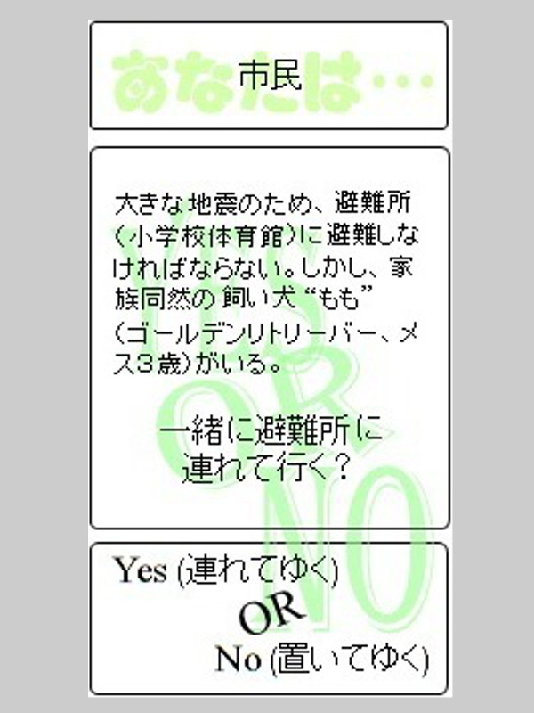 クロスロードの「神戸編・一般編」には、「人数分用意できない緊急食料をそれでも配るか」「学校教育の早期再開を犠牲にしても学校用地に仮設住宅を建てるか」といった、食料や物資の配布、指示や命令、治療の優先順位をつけるトリアージなどの分野で、神戸市の職員が実際に遭遇した難しい判断やジレンマをもとに作成された30の設問が用意されている。