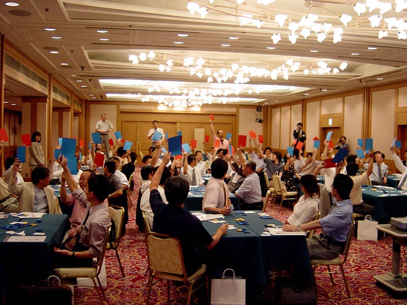 5人1組(あるいは7人1組)の参加者は、1つの設問についてYES/NOのどちらかのカードを選び、場に伏せる。一斉にカードを開き、多数派になったほうが「青い座布団」を獲得。チーム内でYESもしくはNOを選んだ理由を1人1人説明し、話し合ったら、次の設問に移る…というのが基本ルールだ。