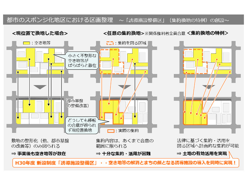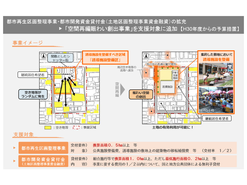 また、「空間再編賑わい創出事業」は社会資本整備総合交付金や都市開発資金貸付金による支援対象にも追加されている。計画的な集約換地と賑わい創出、交付金などによる充実した支援など、行政・地権者の双方にメリットがある制度となっているのだ。
