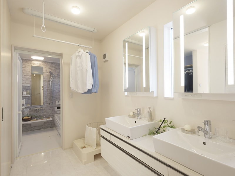 朝の身支度タイムもダブルボウルでスイスイ。洗濯物干し&片付けや、メイクにまで配慮した洗面室