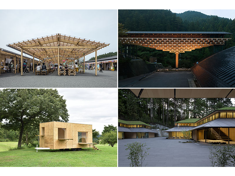 左上)震災後の仮設商店街をかさ上げ後の高台に移転した南三陸さんさん商店街。南三陸杉で建てられ、仮設時のぼろさを残した温かみのある空間が特徴(Minamisanriku Sun Sun Shopping Village © Keishin Horikoshi/SS Tokyo) 右上)町内に4軒もの隈氏設計の建物が点在する高知県梼原町。すべて町面積の9割以上が山林という土地柄を彷彿とさせる木の建築だ(Yusuhara Wooden Bridge Museum © Takumi Ota) 左下)国立競技場のような大きな建築から小さなモバイルハウスまで手掛け、建物の規模は様々。住箱はアウトドア用品メーカースノーピークと組んで生まれた木で作られたトレーラーハウス(Jyubako @ Kengo Kuma & Associates) 右下)ポートランドの日本庭園にあるのは日本の伝統的な住宅をイメージしつつもミニマムで現代的な3棟。緑化された屋上など環境に配慮した仕様にも注目(Portland Japanese Garden © Jeremy Bittermann)※梼原町を除き、すべて2017年これからは「つくっておしまい」ではない世界へ