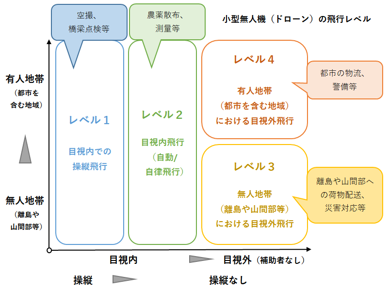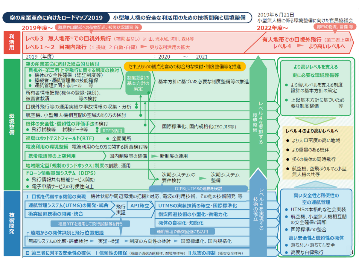 官民協議会では「空の産業革命に向けたロードマップ2019」を定め、その中でドローンの利活用の目標として、飛行レベル4「都市を含む有人地帯での目視外飛行」の2022年度までの実現を掲げている。ちなみに飛行レベル1は目視内での操縦飛行、レベル2は目視内での自動飛行、レベル3は、離島や山間部などの無人地帯での目視外飛行となっている。楽天と西友が2019年7月から約3ヶ月の期間限定で実施している、東京湾の猿島への食料品などの配送サービスは、このレベル3に該当する。
