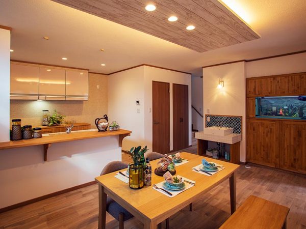 消費者の食への関心は高まり、嗜好も多様化しているため、住宅会社の慣例や視点で提案するのではなく、食の視点で建築を考えることにした。そこで第一弾として、調理・収納・片付けがしやすい空間について、旭川の離乳食アドバイザーの女性から要望を細かく聞き取り、自宅兼料理教室を手がけた。多くの人が集まれる広いダイニングスペースを確保し、水槽を埋め込んだ壁でダイニングとプライベートなリビングを分離させた。
