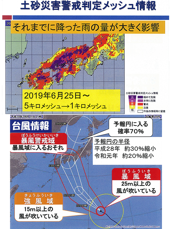 講演で斉田氏は、「台風情報」をはじめ、「記録的短時間大雨情報」「特別警報」「洪水警報の危険度分布」などの気象情報が、この数年間に新たに登場したり、更新されてより精度の高いものになったりしていると解説。例えば台風情報は、予報円の半径が数年前の60%以下の大きさになり、2019年からは「暴風警戒域」が5日先まで発表されるようになったことから、「より早い段階で台風の動きや危険性を把握できるようになり、それだけ対策も立てやすくなっています」と紹介した。